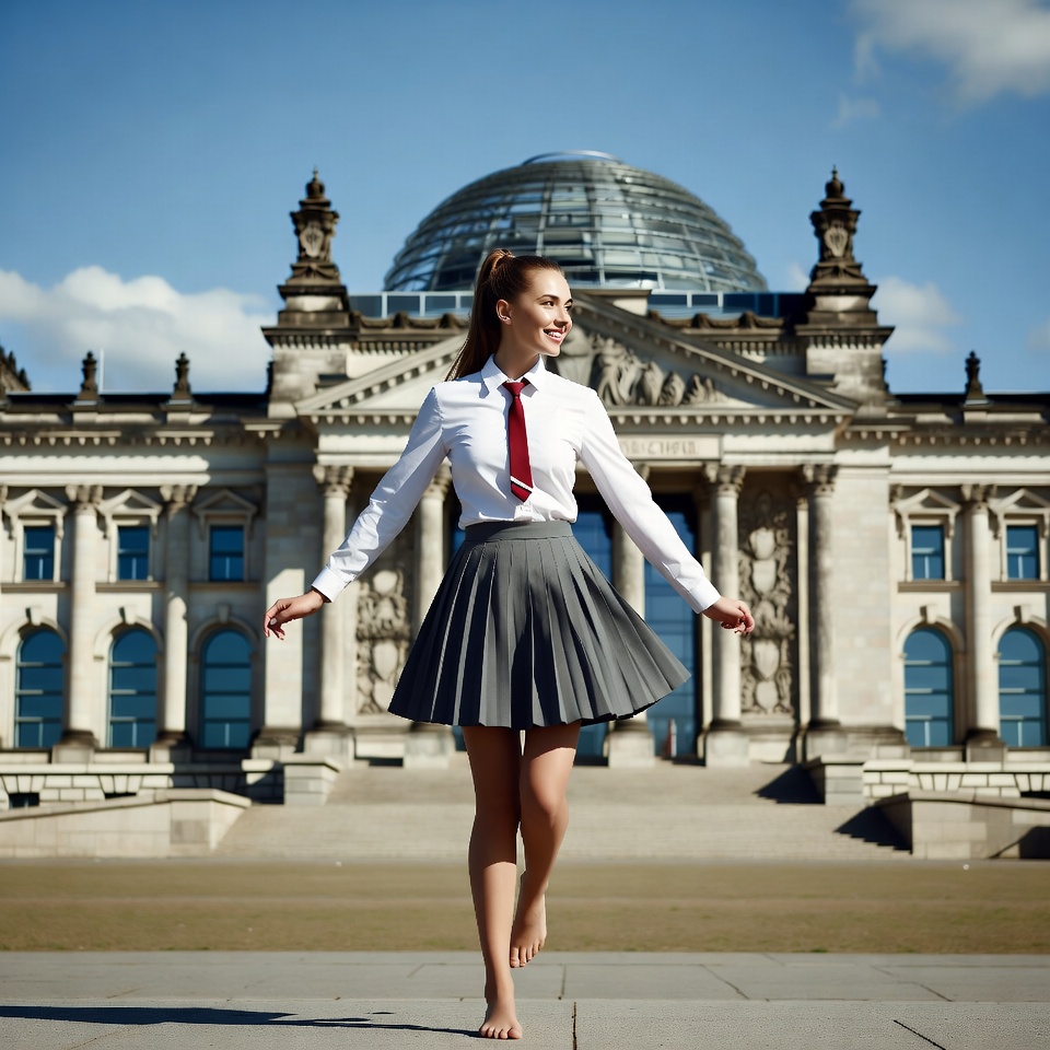 The glass dome of the Reichstag symbolizes transparency and modern democracy. In a beautiful way, her barefoot dance mirrors that same openness — unfiltered, confident, and alive.