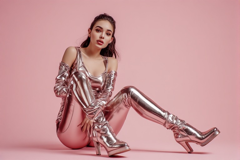 Her outfit immediately catches the light — shiny metallic boots that flow into matching leggings, designed as one seamless piece. The reflective surface turns every movement into a statement. Silver tones shimmer with each step, drawing attention without asking for it. ✨